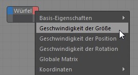 Sehr oft wird der im Node ermittelte Wert erst durch die Wahl eines oder mehrerer Ausgänge präzisiert. So kann bei einem Objekt-Node über den Typ des Ausgabe-Ports präzisiert werden, ob z.B. die Position, die Rotation oder die Größe als Ausgabewert gewünscht werden. Wie bereits bei den XGroups, so verbergen sich auch bei den Nodes unter der blauen Schaltfläche in der Titelleiste des Nodes die jeweils angebotenen Typen für die Eingänge und unter der roten Schaltfläche die Ausgabeparameter. Welcher Datentyp dabei Verwendung finden soll – z.B. muss bei einem Node der Werte addieren soll festgelegt werden, ob dies Vektoren, Fließkomma-Zahlen oder Integer-Werte sein sollen – wird dabei über den Attribute-Manager gesteuert. Dort sind alle relevanten Parameter in einem Menü aufgelistet und abrufbar, sofern Sie dort den Node- oder den Parameter-Modus aktiviert haben.