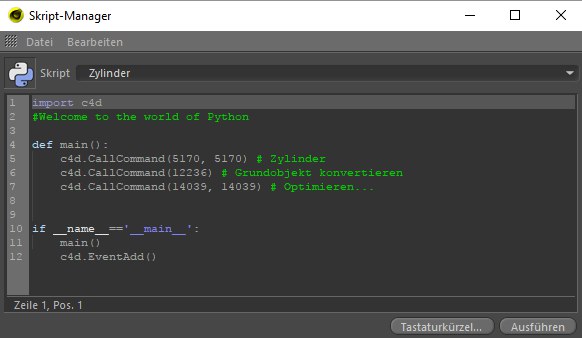 Ein beherzter Klick auf diesen Button wird das Skript ausführen. Eventuelle Fehlermeldungen werden in der Konsole (Hauptmenü: Erweiterungen/Konsole) ausgegeben.