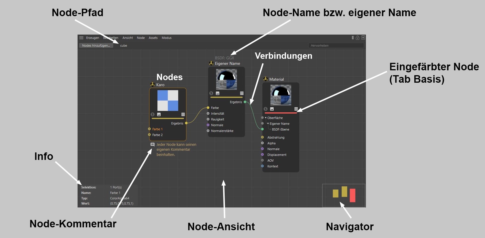 Der Node-Editor ist die zentrale Instanz beim Erstellen und Bearbeiten von Material-Nodes (im Folgenden einfach "Nodes" genannt). All das, was Sie in der Node-Ansicht sehen, muss mit einem Node-Material (beachten Sie diesen Hinweis) verknüpft sein, d.h. um Nodes erzeugen und bearbeiten zu können, muss ein Node-Material selektiert sein. Der Node-Editor zeigt stets das aktuell selektierte Node-Material an.
