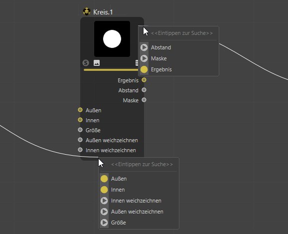 Klicken Sie auf das Verbindungs-Icon rechts neben dem Parameternamen und wählen Sie aus dem Kontext-Menü "Verbinde Node" einen beliebigen Node aus, um diesen mit dem angeklickten Eingang zu verbinden (Sie können natürlich auch in der Node-Ansicht einfach die Ports verbinden). Dabei wird der ausgewählte Node erzeugt und verknüpft: