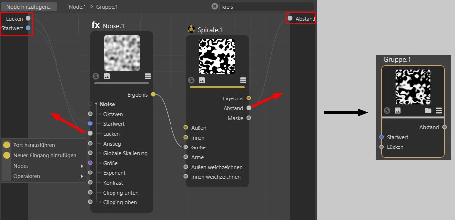 Das macht bei einzelnen Nodes wenig Sinn, aber wenn Sie z.B. Gruppen ineinander verschachteln, können Sie hiermit einen Port erzeugen, der als Gruppenport (wie unten in der Abbildung rechts) angezeigt wird. D.h. Sie können selbst bei einer Gruppe in einer Gruppe einen bestimmten Node-Port auf unterster Ebene von außen füttern (oder auch als Ausgang nach außen führen).