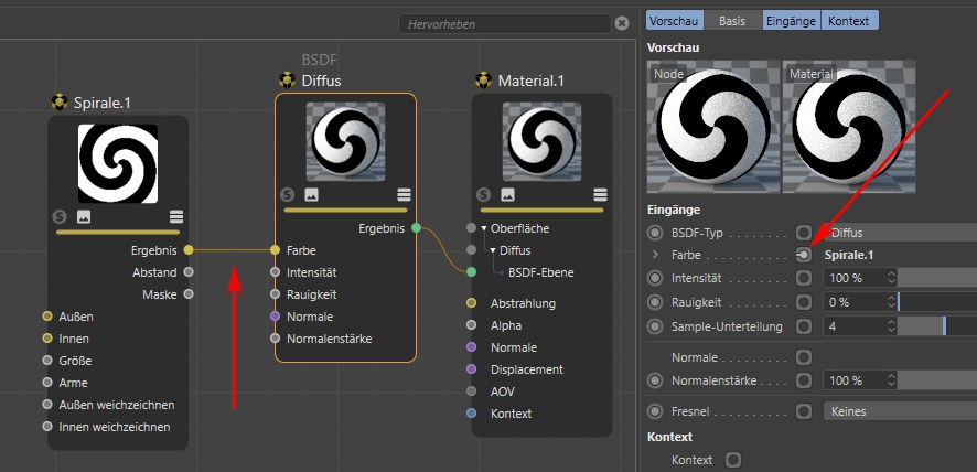 Wie von XPresso her bekannt, lassen sich aber auch artfremde Ein- und Ausgänge miteinander verbinden. Es findet dann in der Regel eine sinnvolle Konvertierung der Datentypen statt. So kann z.B. eine Textur auch an einen Eingang für Fließkommawerte geknüpft werden. Die RGB-Werte der Textur werden dann automatisch in Helligkeitswerte umgerechnet. Auf diese Weise können auch Farbtexturen zur Steuerung z.B. der Rauigkeit einer "BSDF"-Ebene verwendet werden. Derartige Umrechnungen von Datentypen werden am empfangenden Node durch einen zusätzlichen Punkt am entsprechenden Eingang angezeigt.