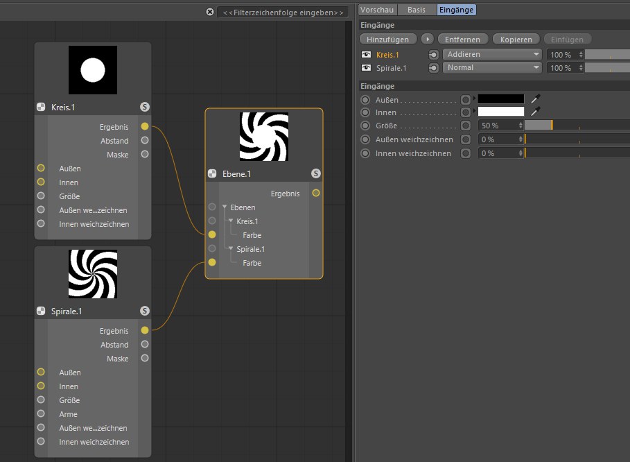 Einige Nodes wie z.B. der Ebenen-Node oder der Farbverlauf bieten Ihnen diesen Modus an. Aktivieren Sie diesen, um z.B. die Ebeneneinstellungen als animierbare bzw. ebenfalls durch das Verbindungs-Icon regelbare Parameter anzuzeigen. Darüber hinaus können die Eingangsparameter des fütternden Nodes eingeblendet werden, wenn Sie auf eine der Ebenen aktivieren. In folgendem Beispiel wären das die Eingänge des "Kreis"-Nodes: