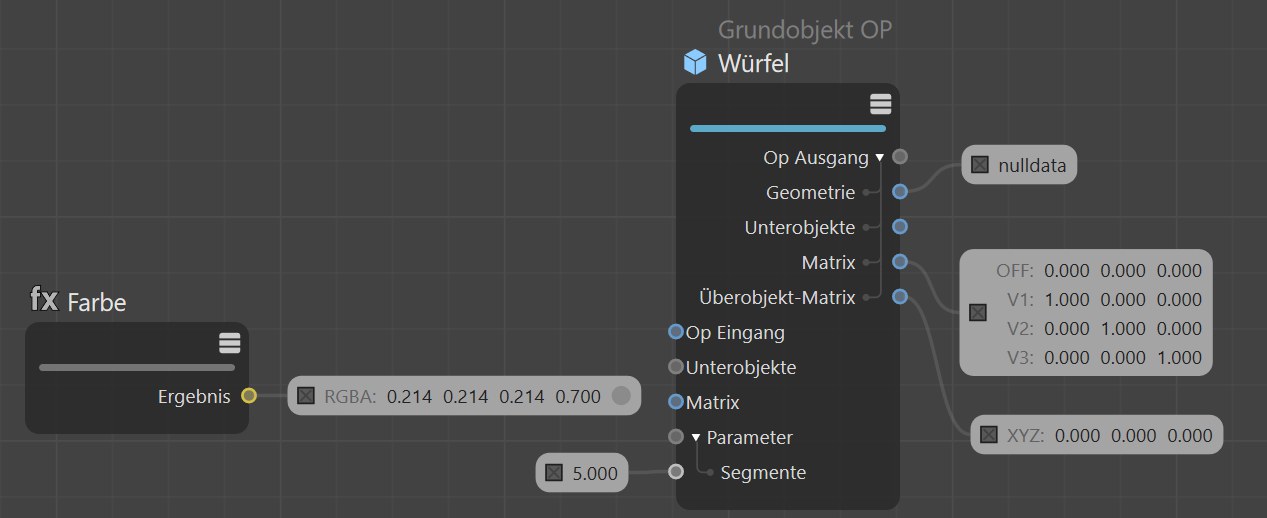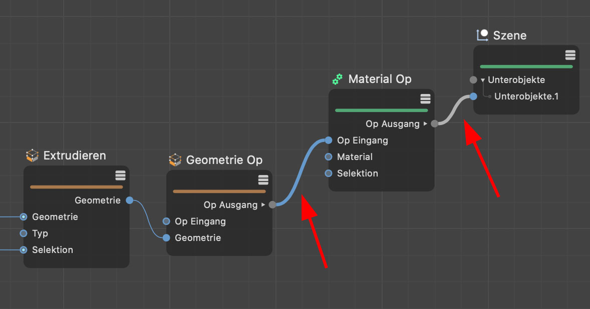 Einige Nodes im Szenen-Node-Editor haben eine dick dargestellte "OP Ausgabe"-Verbindung:Bei diesen Verbindungen handelt es sich um ein Bündel von verschiedenen Werten. Klappen Sie es mit dem kleinen Pfeil am Port "OP Ausgabe" auf, um den Wertetyp einblenden zu lassen. Um in der Szene sichtbare Geometrie zu erzeugen, sollte immer ein "OP Ausgabe"-Port mit dem Szenen-Port verbunden werden.