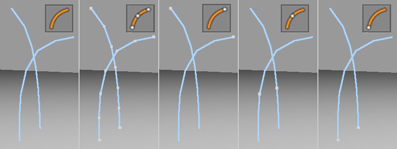 Von links nach rechts: Modus Guides, Punkte, Spitzen, Vertex, Wurzel.
