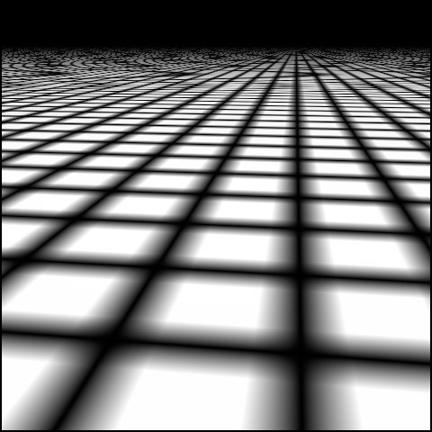 Bei der Kreis-Interpolation haben die Textur-Pixel einen runden Einflussbereich. Inhaltsreiche Texturen erhalten dadurch bei einer Vergrößerung ein natürlicheres Aussehen. Wie das Bild beweist, eignet sich diese Interpolation nicht so gut bei geraden Strukturen. Die Linien erscheinen an den Rändern zerfranst. Auch hier erscheint die Textur am Horizont unruhig und würde in einer Animation stark flackern. Die Kreis-Interpolation ist für alle sehr kleine Texturen (z.B. 3x3 Pixel) geeignet, sodass die einzelnen Texturpixel sehr weich ineinander übergehen.