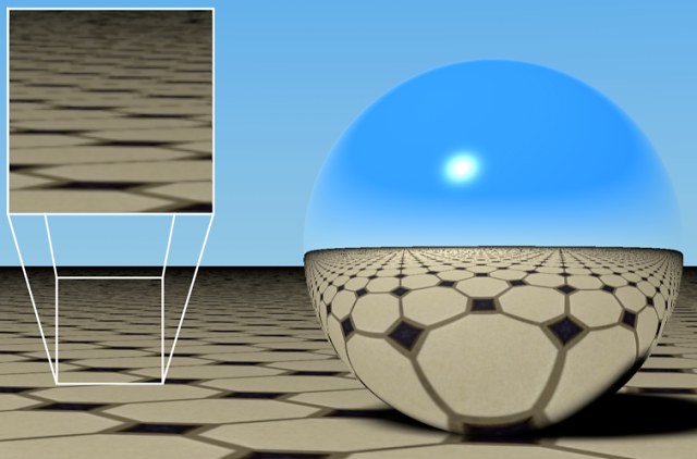 Der Grund dafür liegt in der perspektivischen Verzerrung. Auf ein Bildschirm-Pixel, das den Boden nahe des Horizonts zeigt, werden viele hundert oder gar zigtausend Texturpixel abgebildet. MIP- und SAT-Mapping machen nun nichts anderes, als aus all diesen betroffenen Textur-Pixeln den Mittelwert zu bilden. Wie Sie sicherlich ahnen, kann dies aus Rechenzeitgründen nur angenähert werden. Das Ergebnis sehen Sie in der zweiten Abbildung. Als Interpolationsart wurde SAT-Mapping gewählt. Alle störenden Effekte sind jetzt verschwunden. Selbst in der Reflexion der Kugel sieht jetzt alles perfekt aus!