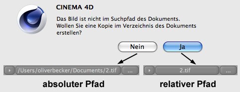 Wenn Sie übrigens Materialien (mit verknüpften relativen Texturpfaden) in ein anderes Projekt kopieren und diese von dort aus nicht gefunden werden, erfolgt eine Abfrage, ob ein absoluter Texturpfad (zum Originalpfad) gesetzt werden soll. Wenn Sie dann verneinen, müssen die Texturen manuell zu den CINEMA 4D bekannten (relativen) Pfaden kopiert werden.