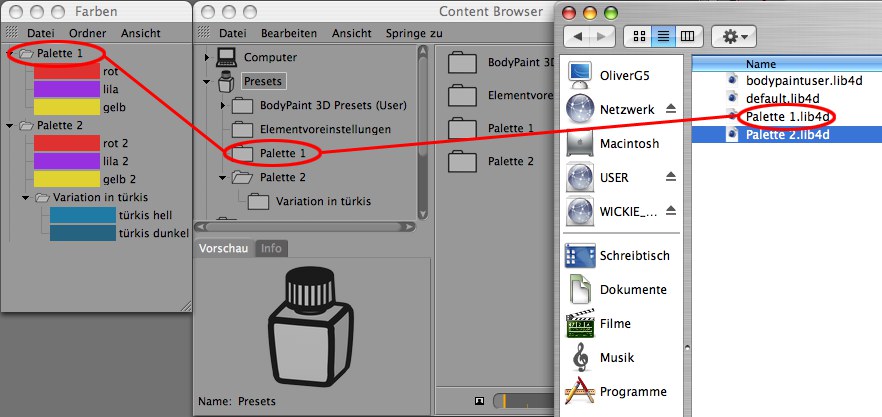 Nach Aufruf des Befehls öffnet sich ein Dateiauswahldialog. Navigieren Sie jetzt zu Ihrem alten BodyPaint 3D-Verzeichnis, öffnen dort das Verzeichnis prefs und laden die Datei bodypaint_colors.b3d. Die Presets werden dann zu einer Content Browser-Bibliothek umgewandelt. Diese finden Sie dann voreinstellungsgemäß in Ihrem Benutzer-Verzeichnis unter library/browser/bodypaintuser.lib4d. - Presets von BodyPaint 3D-Versionen nach R2.5 (die also als "*.lib4d"-Datei vorliegen) werden, wenn Sie von einem Datenträger angewählt werden, in Ihr library-Verzeichnis (library/browser) kopiert und gleichzeitig in den Farb-Presets zur Verwendung geöffnet.