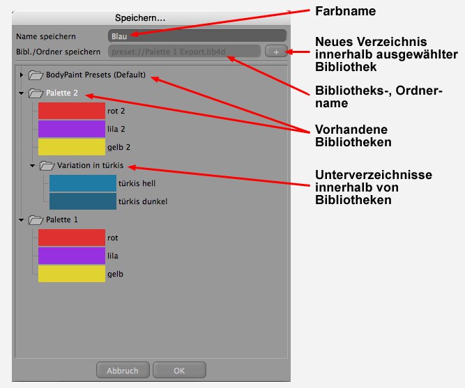 Hier können Sie neben dem Farbnamen auswählen, in welcher Bibliothek und welchem Bibliotheksverzeichnis die Farbe gespeichert werden soll. Wählen Sie einfach das entsprechende Element aus. Der +-Button lässt Sie für das ausgewählte Element ein Unterverzeichnis erstellen. Sobald Sie auf OK klicken, wird die Farbe gespeichert (das aktuell ausgewählte Farb-Preset kann dabei – nach einer Sicherheitsabfrage – überschrieben werden).
