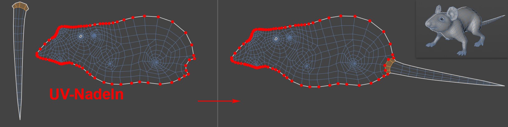 Mit UV-Nadeln fixierte UV-Punkte bleiben unverändert, sofern UV-Nadeln für UV-Entspannung verwenden aktiviert und Automatische Neuausrichtung deaktiviert ist. So bleibt der Befehl auf den Mauseschwanz beschränkt, der mittels Polygonselektion mit dem Mausekörper verschweißt wird.