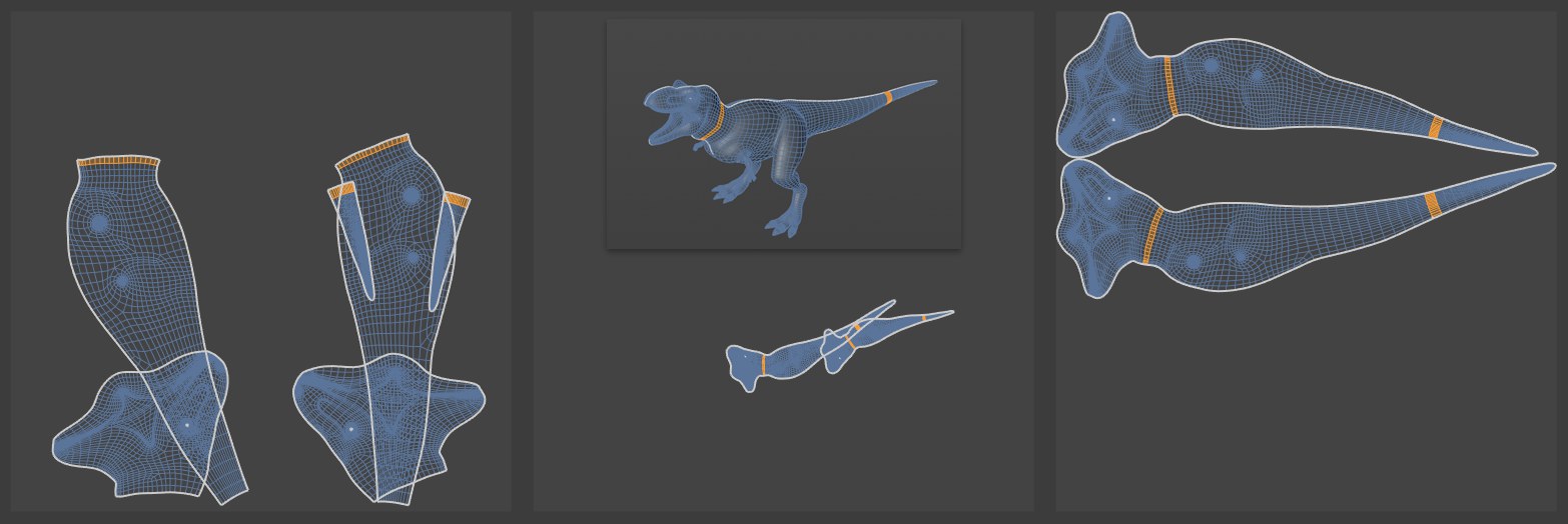In der unteren Bildhälfte sorgt eine selektierte UV-Nahtkante, dass die beiden Dinosaurier-Kopfhälften sauber verschweißt und angeordnet werden.