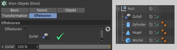 Bei aktiviertem klonerzeugenden Objekt wird bei Erzeugung eines Effektors dieser direkt in die Effektoren-Liste (Abbildung links) aufgenommen.