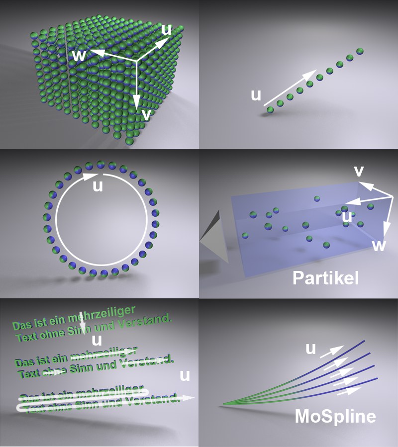 In MoGraph kommen öfters mysteriöse Parameter namens U und V vor. Dazu sollten Sie wissen, dass alle Klone intern U,V,W-Koordinaten haben. Ein solches Koordinatensystem verläuft stets von 0 bis 1. Wie ist dieses Koordinatensystem über die Klone aufgespannt? Für die gängigsten Klonmethoden sehen Sie das in dieser Abbildung:
