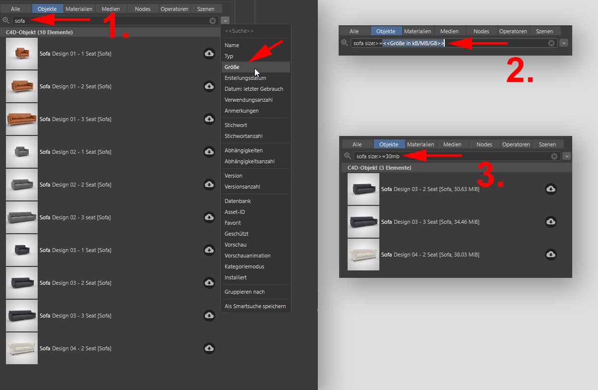 Sie möchten alle Assets finden, in deren Name "Sofa” vorkommt und bei denen die Dateigröße mindestens 30MB beträgt.
