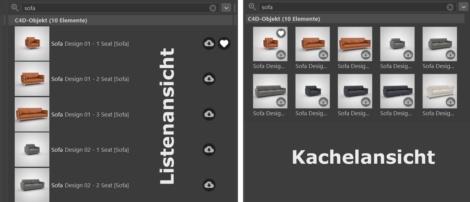 Die Ansicht von Assets in den beiden Ansichtsmodi. Beachten Sie jeweils die Icons für Herunterladen und Favorit.