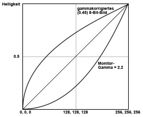 Nur mit diesem Gamma sehen Bilder auf einem durchschnittlichen Monitor gut aus. Das hängt damit zusammen, dass Bilder niedrigerer Bittiefe (8 Bit und 16 Bit) so abgespeichert werden, dass ein für das menschliche Auge zufrieden stellender Helligkeitsverlauf dargestellt wird. Das Auge vermag in dunklen Bildbereichen feinere Abstufungen zu erkennen, als in hellen.