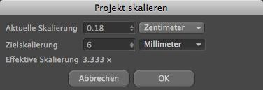 Angenommen, die beiden Punkte liegen 0.18 cm auseinander, müssen Sie nur noch folgende Werte hier eingeben und die Szene wird korrekt skaliert: