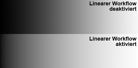 Der in einem regulären Graustufenverlauf auf halber Länge gespeicherte Farbwert von 128,128,128 (Option Linearer Workflow deaktiviert) ändert sich bei aktivierter Option auf ca. 192,192,192). Dieses Verhalten ist RICHTIG!