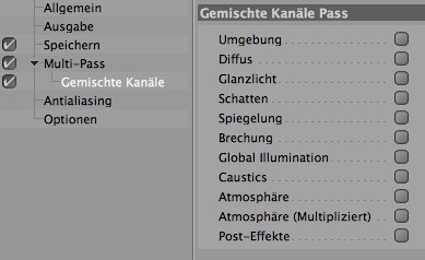 Die in dieser Multi-Pass-Seite gemachten Einstellungen gelten global und bedürfen teilweise weiterer Einstellungen in bestimmten Objekt-Dialogfenstern.