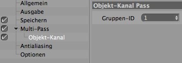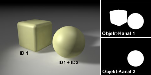Hier geben Sie eine Gruppen-ID ein. Dieselbe ID können Sie per Render-Tag an beliebig viele Objekte vergeben. Beim Rendern wird für jeden aktivierten Objekt-Kanal ein Alpha-Kanal entsprechend der definierten IDs berechnet. Ein Beispiel wird das verdeutlichen.
