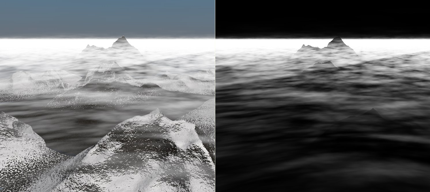 Links das normale gerenderte Bild, rechts der Multi-Pass "Athmosphäre".