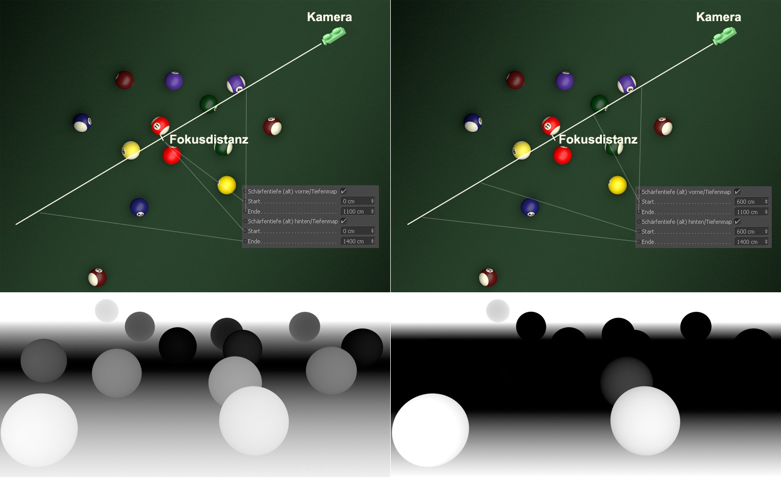 In den Kameraeinstellungen (Schärfentiefe (alt) vorne/Tiefenmap und folgende) kann ausgehend von der Fokusebene jeweils ein Bereich davor und dahinter definiert werden, in dem Objekte in einem Graustufenverlauf von Schwarz nach Weiß gefärbt werden. Schwarze Bereiche des Renderings bleiben dann später scharf, während weiße komplett weichgezeichnet werden.