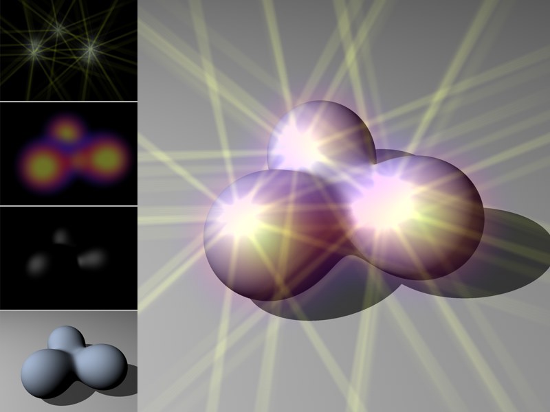 Mit diesem Kanal ist es möglich, eine Vielzahl von Post-Effekten (PyroCluster, Linseneffekte, Vektor Motion Blur, Glanzlichter, Glüheffekte, Glühen) auf separate Ebenen zu rendern.
