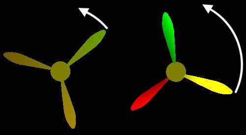 Ein Motion-Vektor-Multi-Pass: links ein langsam laufender Propeller, rechts ein schneller.