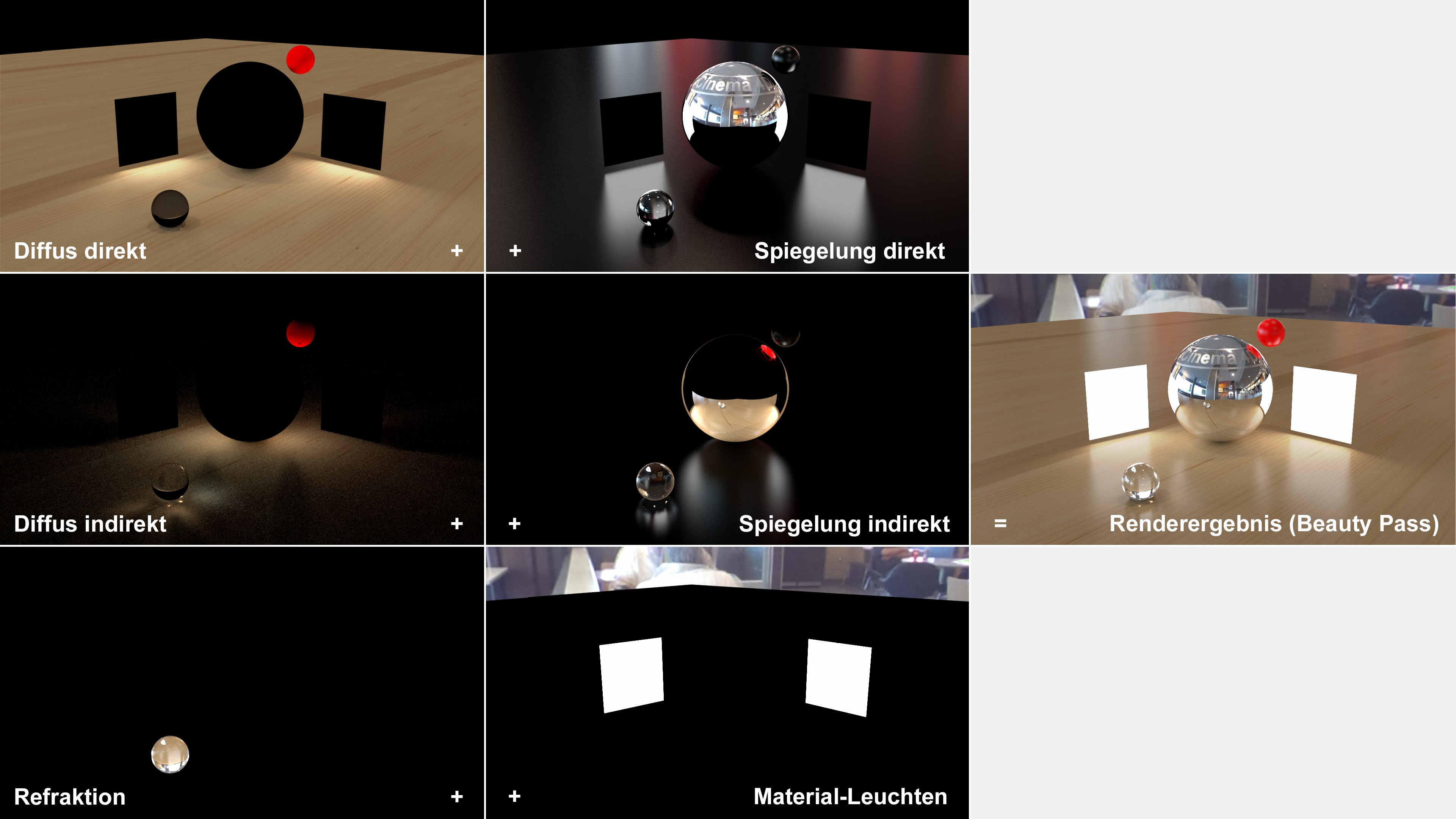 Das Ganze funktioniert nur, wenn Sie, wie oben erwähnt, ausschließlich physikalische Materialien verwenden und folgende Multi-Passes rendern und addieren: