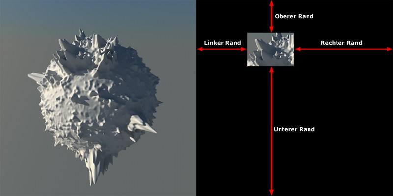 Hiermit stellen Sie die schwarzen Balken, ausgehend von den Bildrändern, in Pixel ein. Beachten Sie, dass bei der Eingabe ungültiger Werte (Ränder z.B. größer als das zu rendernde Bild) keine Ränder gerendert werden.