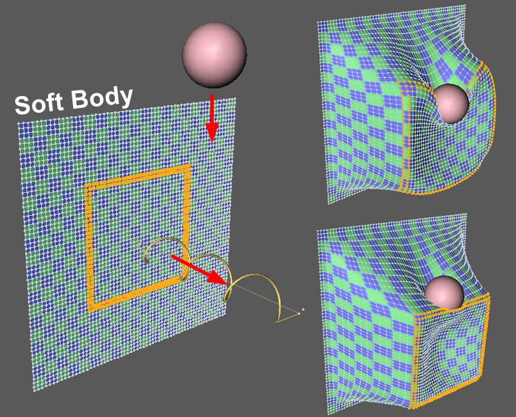 Markierte Punkt-Selektion eines Soft Bodies wird von einer Feder gezogen, gleichzeitig fällt eine Kugel auf die Selektion. Rechts oben kleiner, rechts unten großer Wert für Formbewahrung.