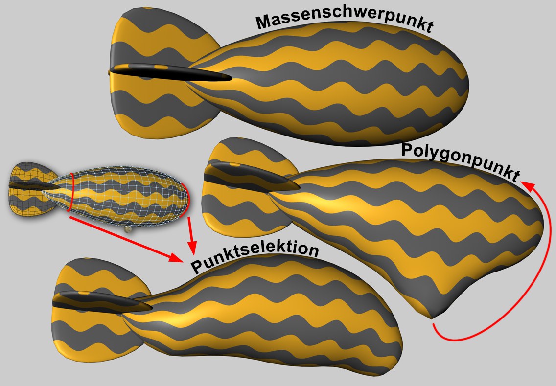 Krafteinleitungen können auch per Map (Punkt-Selektions-Tag oder Vertex-Maps) vorgenommen werden. Es gibt hierbei dann einige zusätzlicher Parameter, die regeln, wie stark sich dann die Gestalt der selektierten (bzw. gewichteten) Punkte als ganzes ändern darf