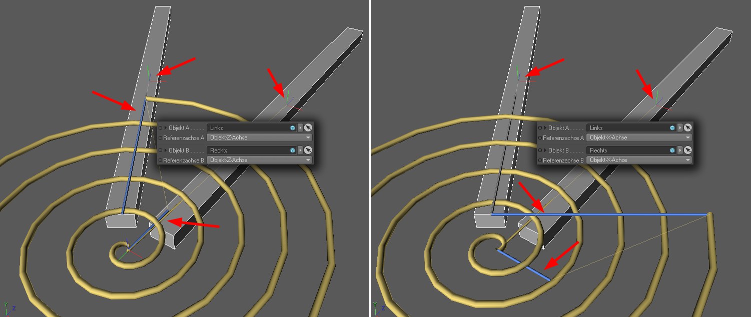 Ähnlich stellt es sich bei der Drehfeder dar: Beachten Sie, wie die beiden blauen "Federenden" sich jeweils nach der definierten Achse ausrichten. Objekt-Y-Achse würde in diesem Fall auch wenig sinnvoll sein.