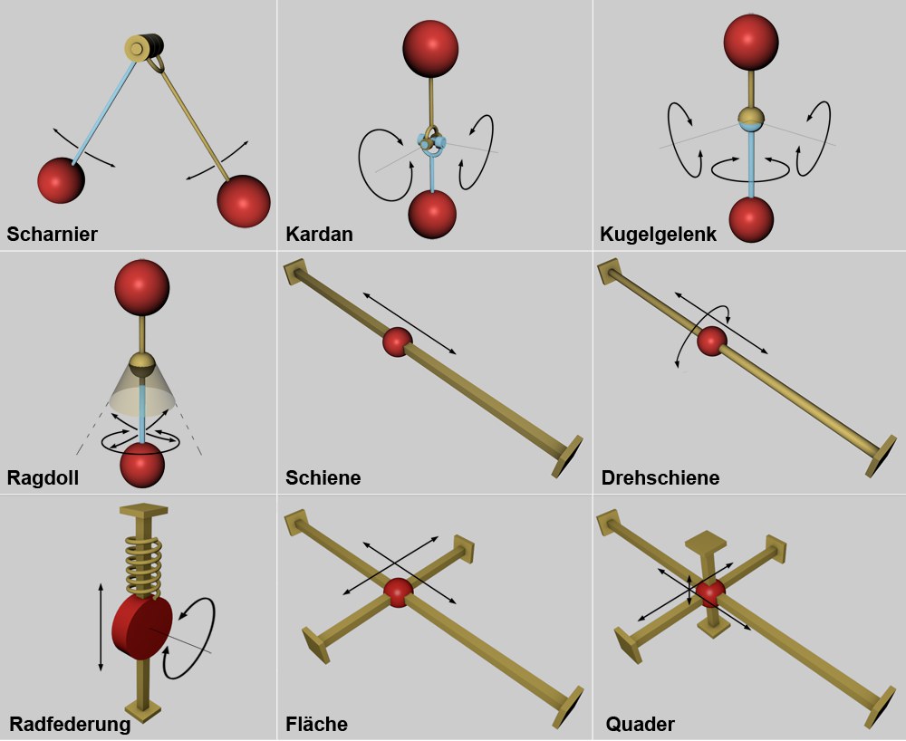 Wie die beiden zu verbindenden Objekte in der Reihenfolge Objekt A und Objekt B zugewiesen werden, spielt bis auf den Konnektorentyp Ragdoll und Radfederung keine Rolle.