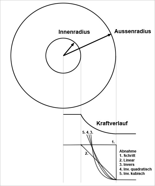 Bei den inversen Kräfteverläufen erreichen die Kräfte zwischen den beiden Radien die definierte Stärke um sich bei Annäherung an den Innenradius bis zum Maximum der 10-fachen Stärke zu erhöhen.