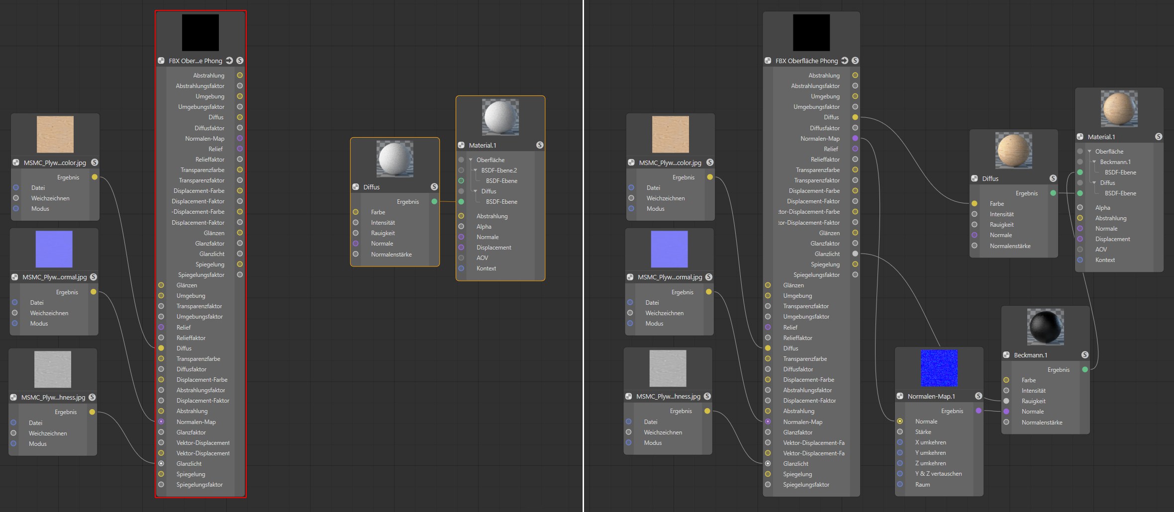Da die Materialeigenschaftswerte nicht eindeutig interpretiert werden können – verschiedene Programme mit ihren jeweils eigenen Einstellungsauslegungen und Materialmodellen funktionieren anders als in Cinema 4D gewohnt - ist es an Ihnen, die vom Node gelieferten Werte und Texturen sinnvoll mit dem BSDF-/Material-Node (Standard/Physikalischer Renderer) zu verschalten. Das ist beispielhaft in der rechten Abbildungshälfte dargestellt. Da wurde z.B. der Diffus-Ausgang mit dem Farbe-Eingang des Diffus-Nodes verknüpft oder eine Rauhigkeits-Textur in einen BSDF-Node gefüttert, der dem Material-Node eine zweite, spiegelnde Ebene verleiht. Es könnte aber genauso gut sein, dass Sie bei dieser Rauhigkeits-Textur die Helligkeit mit einem Farbe invertieren-Node umkehren müssen, weil das exportierende Programm eine solche Textur anders interpretiert. Das und ähnliches sind Dinge, die Cinema 4D nicht weiss und daher von Ihnen verdrahtet werden müssen.