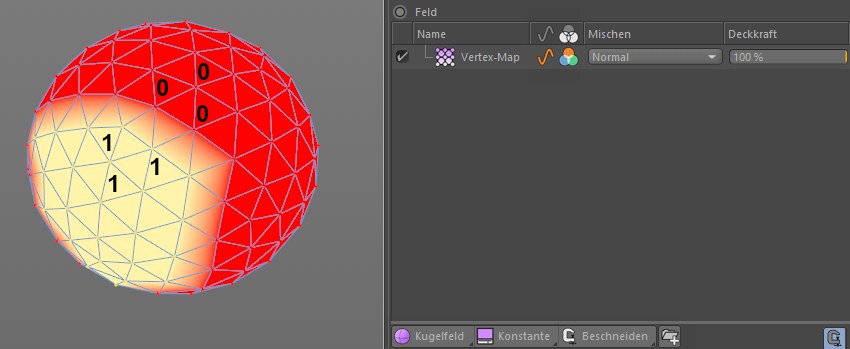 Hier wirkt die Vertex-Map einer Kugel mit ihren Werten mittels einer Varablen-Tag-Ebene. Die Varablen-Tag-Ebenen anderer Tags funktionieren analog.