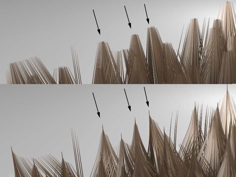 Büschel ist ein Maß für die Stärke, wie umgebende Haare zum Büschelhaar gezogen werden. Wie Sie in obiger Abbildung erkennen können, werden bei kleinen Werten die entsprechenden Haare nur ein wenig zum Büschelhaar hingezogen, während große Werte dafür sorgen, dass alle Haare eines Büschels sich an der Spitze treffen.