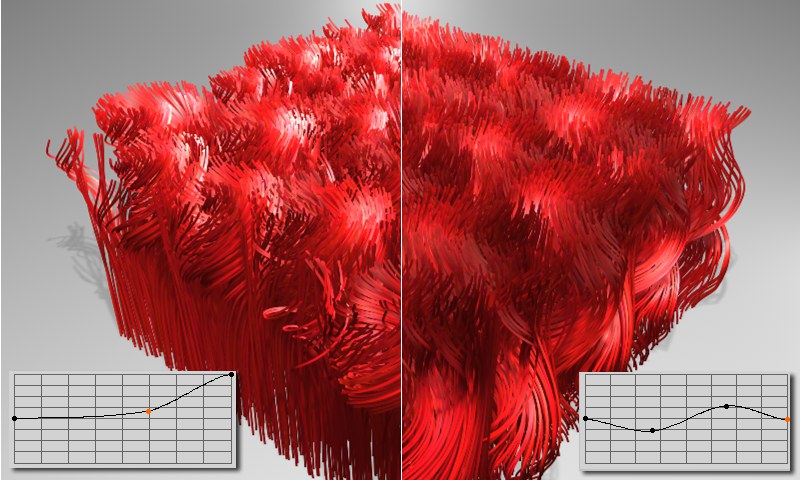 Regeln Sie mit diesem Funktionsgraphen die Büschel-Stärke (Parameter Büschel, ganz oben) über die Länge des Haares. Die Kurve kann auch durch negative Bereiche laufen, wobei die Haare auseinander gedrückt werden.