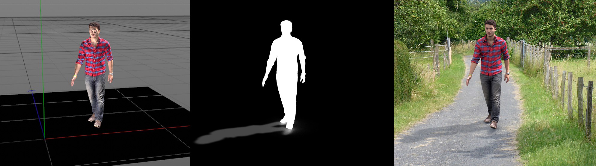 Von links nach rechts: das 3D-Objekt, der gerenderte Alpha-Kanal, das ins Foto eingepasste Rendering.