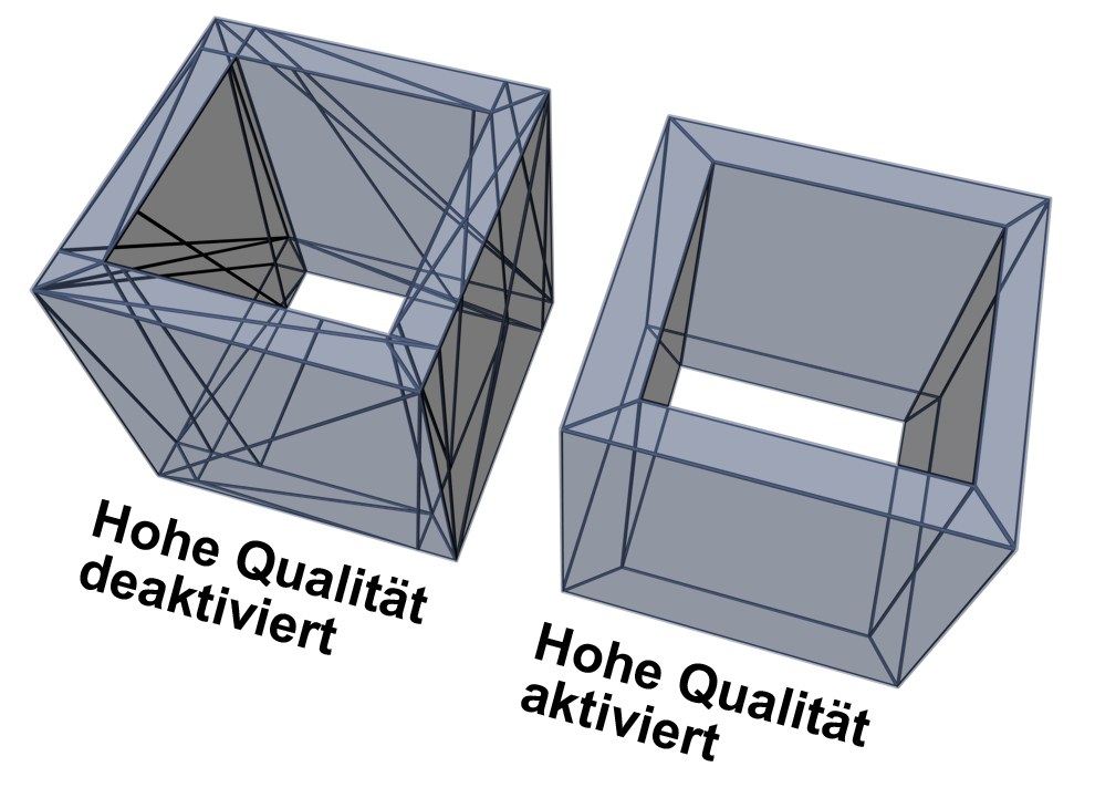 Das Boole-Objekt kann zwei unterschiedliche Algorithmen verwenden (Zusammenlegung mit dem neuen, besseren Better Boole-Objekt). Je nachdem, ob Sie die Option Hohe Qualität aktivieren oder nicht, kommt der neue bzw. alte Boole-Algorithmus zum Einsatz.