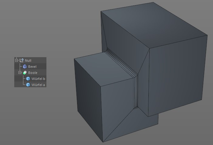 Wenn Einzelnes Objekt erzeugen und Schnittkanten selektieren aktiviert sind, gilt: das Boole-Objekt erzeugt ein (internes, was aber bei bearbeitbar gemachtem Boole-Objekt sichtbar wird) Kanten-Selektions-Tag namens "I" (I wie Intersection). Wenn Sie das Boole-Objekt polygonal machen, wird das Tag sichtbar. Aber selbst im unsichtbaren Zustand kann es überall dort verwendet werden, wo Kanten-Selektions-Tags ausgewertet werden (z.B. bei Selektion des Bevel-Deformers). Tragen Sie in das entsprechende Feld dann den Buchstaben I ein.