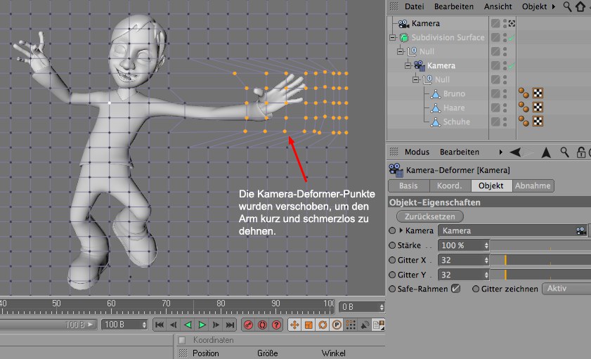 Sie können beispielsweise Objekte dehnen, wenn Sie in die Nähe der Bildränder kommen. Die Kamera-Deformer-Punkte können mit Hilfe von Pose Morph beeinflusst werden. Ein anderer Einsatzzweck des Deformers wäre ein schnelles und unkompliziertes Stauchen und Dehnen von einem oder mehreren Objekten.