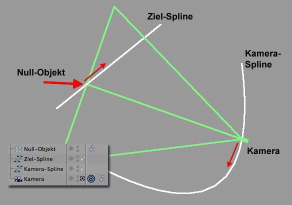 Die elegantere Methode ist das Verwenden von Splines, entlang denen sich die Kamera bewegen soll. Die besten Ergebnisse erzielt folgende Methode: Sie erstellen 2 getrennte Splines. Auf dem ersten (Kamera-Spline) bewegt sich die Kamera (mit dem Auf Spline ausrichten-Tag, dort animierte Position), auf dem zweiten (Ziel-Spline) bewegt sich ein Null-Objekt als Ziel (nach gleichem Prinzip animiert wie Kamera), nach dem die Kamera sich ausrichtet (Ausrichten-Tag).