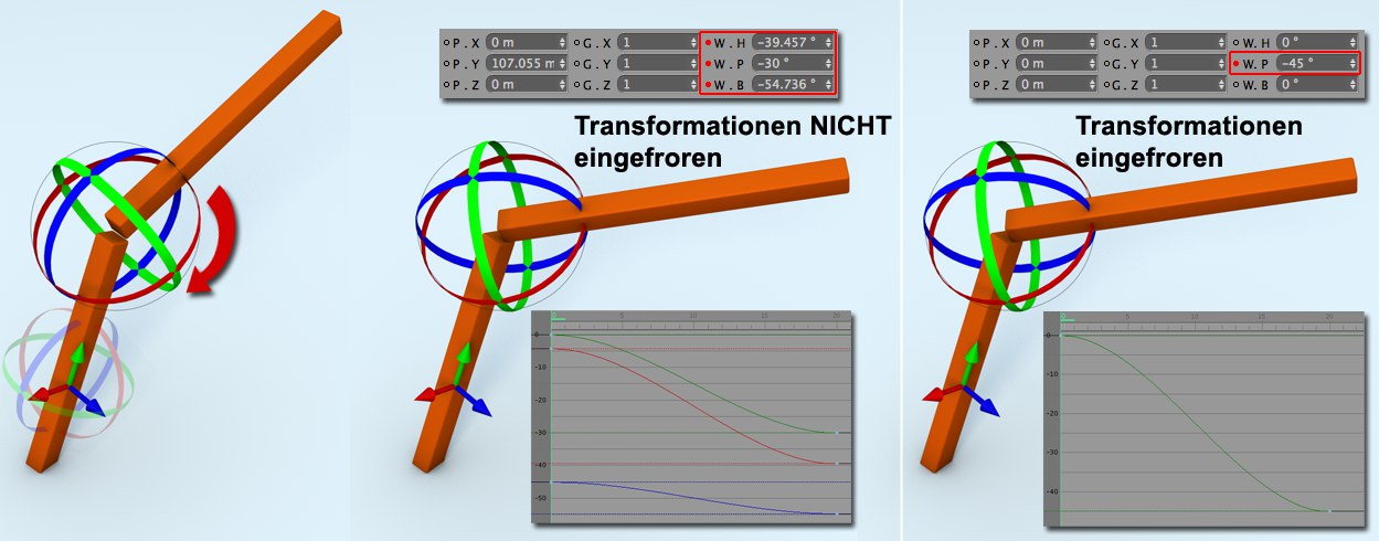 Was dabei passiert, sehen Sie in der Mitte der Abbildung: obwohl nur um eine Achse gedreht wurde, ändern sich alle 3 Winkelkomponenten. Das liegt daran, dass das übergeordnete Koordinatensystem ("Arm 1") gegenüber dem lokalen verdreht ist. Das ist unschön, aber oft nicht zu verhindern. In der Zeitleiste machen 3 evtl. zu bearbeitende F-Kurven die Sache auch nicht gerade leichter. Dazu kommt in diesem Beispiel noch ein Animations-Gimbal-Lock (s. Quaternion-Rotation), der zu einem nichtgeradlinigen Schwenk des Armes führt.
