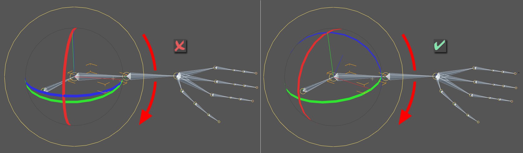 Hier können Sie direkt anhand der Rotationsbänder (VOR einer Animation) sehen, ob die geplante Animation in einer bestimmten Drehrichtung zum Erfolg führen kann oder nicht. In der Abbildung links sehen Sie die roten, grünen und blauen Rotationsbänder so angeordnet, dass eine Drehung (Roter Pfeil) schon gar nicht möglich scheint (keines der Bänder liegt in der Drehebene). Diese Animation wird Probleme mit dem "Gimbal Lock" bekommen.