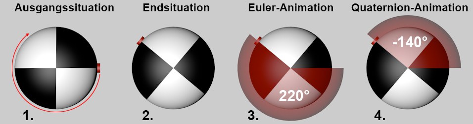 Anmerkung:Der kürzeste Weg für eine Quaternion Expression, ist immer der auf einer 3D Kugel. Man kann sich das ungefähr so vorstellen, dass die Quaternioneninterpolation einer Drehung um eine fixe Achse entspricht. Und zwar der Achse, um die mit dem kleinsten Winkel gedreht werden muss. Diese hat in der Regel mit den Objektachsen nichts zu tun und ist bei jeder Interpolation anders.