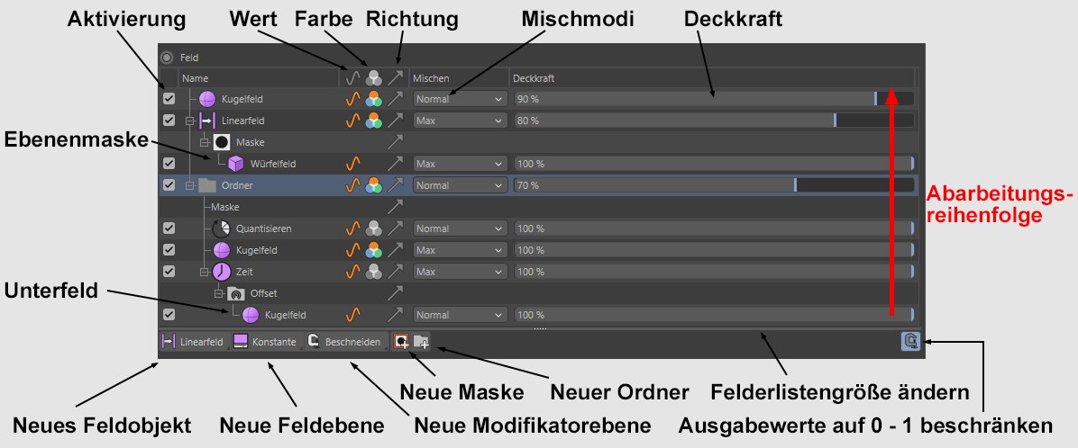 Sie finden in der Felderliste alle Feldebenen, Modifikatorebenen und Ordner in Ebenen organisiert, die von unten nach oben (genauso wie Ebenen untergeordnet in Ordnern) abgearbeitet werden. Das Mischen der Elemente funktioniert ähnlich wie das von Ebenen in einem Bildbearbeitungsprogramm. Jede Ebene hat einen Mischmodus samt Deckkraftregler, die definieren, wie mit den untergeordneten Elementen gemischt werden soll.