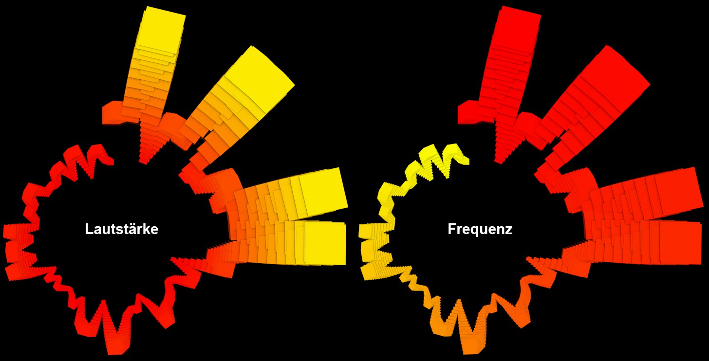 Eine radiale Klonansammlung zuckt im Takt der Musik und wird entsprechend der Richtung eingefärbt.